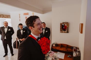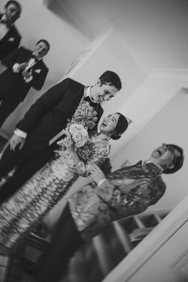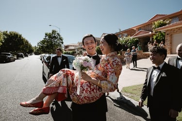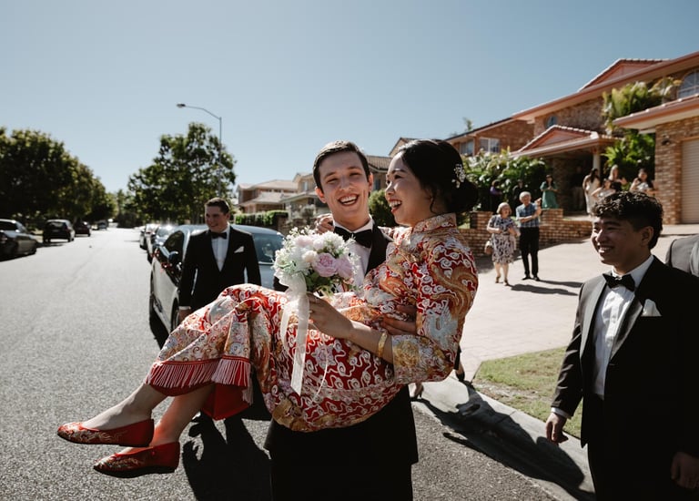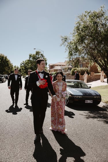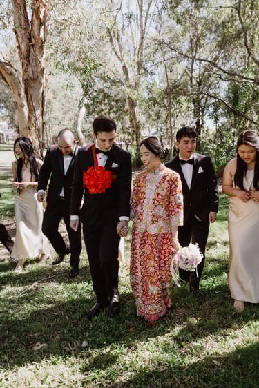 Once Greg finally fulfilled the door game challenges and bartered his way past the bridesmaids who guarded the front entrance, Rachel's dad led her down her household staircase, revealing her custom Qun Kwa (裙褂), her Chinese wedding dress.